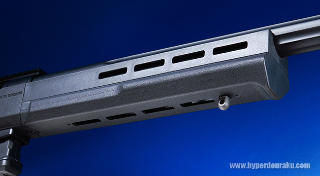 ハンドガードの左右、下面はM-LOKになっています。下面にはバイポッドアダプターも標準装備されています。このハンドガード部のみ着脱も可能で、純正パーツと互換性があります。