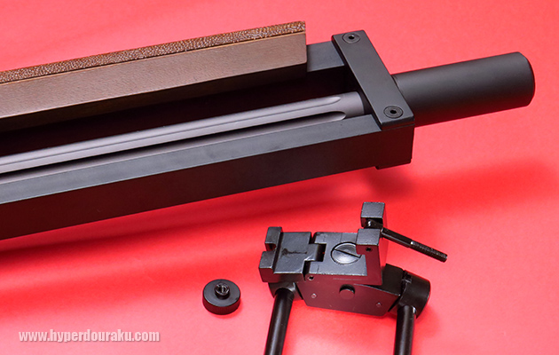 バイポッドはヒンジ式となっており、取外しも可能です。バレル上の角フレームに装着します。