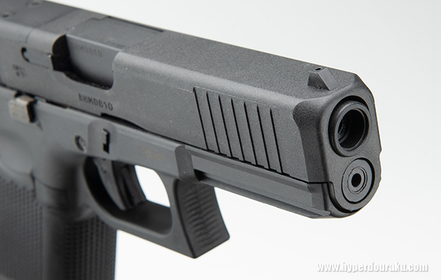スライド前方にもセレーションが切られており、これは現行型のG17 MOSの特徴でもある。スライドフレームともに硬質感のあるナイロン樹脂。