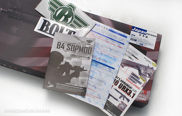 星条旗をバックにSR16の写真がプリントされたパッケージです。箱のサイズは約91×27×9cmになります。銃本体、マガジン、取り説類、保証書、ステッカー、BOLTオリジナルパッチなどが同封されています。BB弾は付属していません。箱の右上には日本仕様であることを示すシールが貼ってあります。