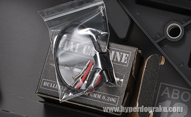 パッケージのストック下にある箱はBB弾ではなく、予備の配線、コネクターが同封されています。コードをひっぱったりして配線が中で断線した時の予備用ということでしょう。