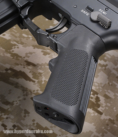 グリップはオーソドックスなA2グリップを使用しています。グリップ底部に放熱用のスリットがありますが、埃が入らないか少し心配です。トリガーガードもナイツタイプのものが装着されています。