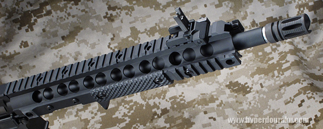 ナイツのURX3.1を標準装備。バレル長は14.5インチです。上面はすべてレイルがありますが、左右と下部はハンドガード先端部のみで最小限のレイル配置となっています。