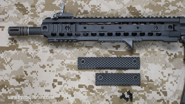 BOLTのSR16にはウロコ状の手にしっかりグリップするロング、ミディアム、ハンドストップ付きショートと3枚のレイルカバーが標準装備されています。