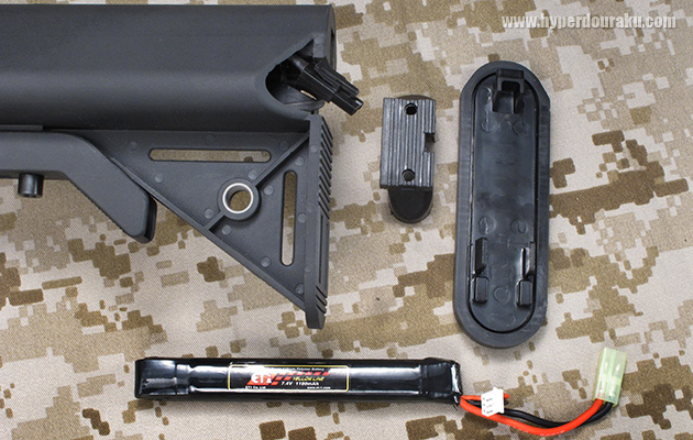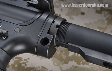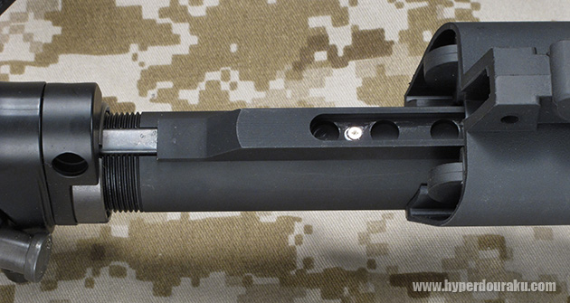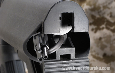 ストックパイプ内にはリコイルシステムが内蔵されていますので、配線はパイプの外、ストック長調節のリブの中を通しています。