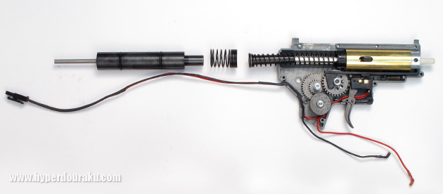 メカボックス、スプリングガイドとも中空になっており、そこをロッドが通ります。