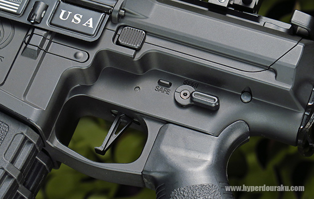 セレクターはアンビ仕様でどちらからでも操作できます。マガジンキャッチもM4と同じ位置にあります。このマガジンキャッチは同時に2本ともリリースします。また、トリガーはストレートタイプが採用されています。