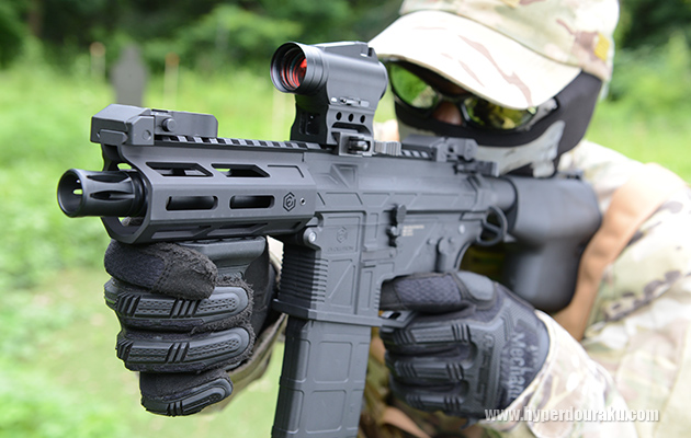 フラッシュハイダーはバードケージで、14mm逆ネジ仕様です。ハンドガードは左右、下面はM-LOKレールです。フォアグリップは標準装備されています。