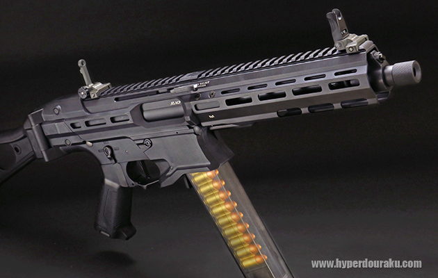 ロアレシーバーはARにどことなく似ていますが、アッパーフレームは完全にオリジナルデザインです。両フレームとも樹脂製ですが、剛性も高く、軋みは全くないです。 最近では実銃でも拳銃弾を使用するピストルキャリバーカービンが流行りです。このPCCという名称もそこから来ているものだと思います。