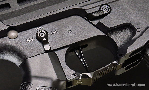 マガジンハウジングに見えるレバーはボルトリリースレバーでアンビ仕様になっています。セレクターも左右操作できるアンビ仕様で、ポジションマークはピクトグラムとなっています。