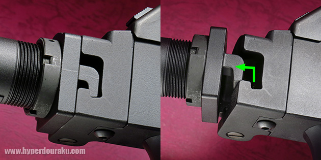 可変ホップアップはエジェクションポート内に調節レバーが設置されています。 前後にスライドさせて調整します。