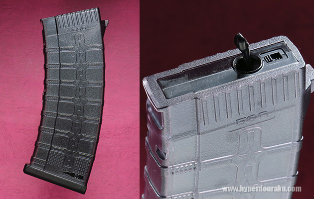 マガジンはプラ製でノーマルのスプリングタイプになります。装弾数は115発もあります。マガジンの重量は193gです。マガジンフォロワーが突き出て最後の1発まで撃てるようになっています。