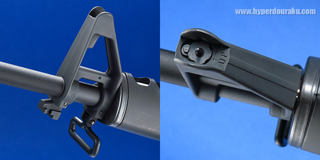 リアサイトを兼ねるキャリングハンドルがM16の特徴です。その名通り、持ち運びに便利です。