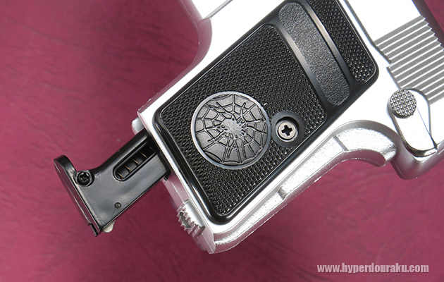 グリップは成人男性では中指までしか掛からないほど短いです。グリップパネルにはチェッカリングが入りますが、「COLT」の表記部分は空欄になっています。またCOLTの「跳ね馬」ではなく、スパイダーの刻印となっています。