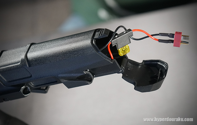 ストックを取り外して、ストックチューブ後部のふたを開ければバッテリースペースにアクセスできる。Tコネクター仕様だ。