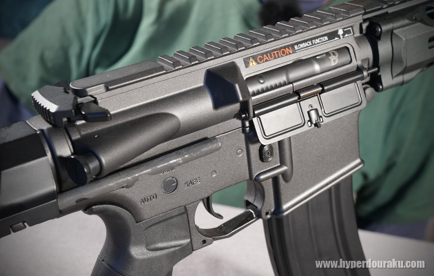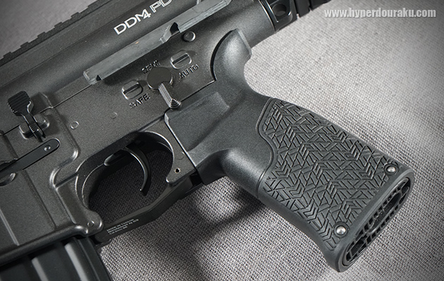グリップは一見してDDっぽいデザインだが、EMGのオリジナルグリップとなっている。またプリコック機能も付いていて、セミオートで撃つとピストンが後退保持される。セレクターをセーフポジションにすればプリコック解除となる機能がある。