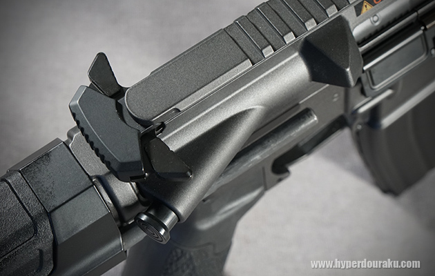 チャージングハンドルは左右にリリースレバーのあるアンビタイプ。引けば連動してダミーボルトが後退しホップダイヤルにアクセスできる。