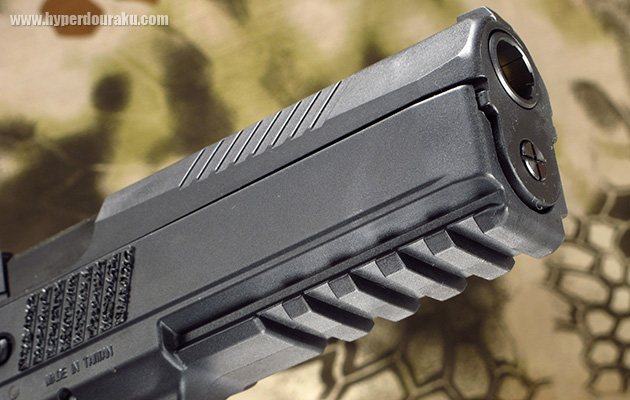 迫力あるマズル周り。スライド前部は斜めにカットされおり、セレーション加工も施されております。ただし斜めなのでスライドの前方は持つのではなく、上から覆うように操作するのがよいと思います。