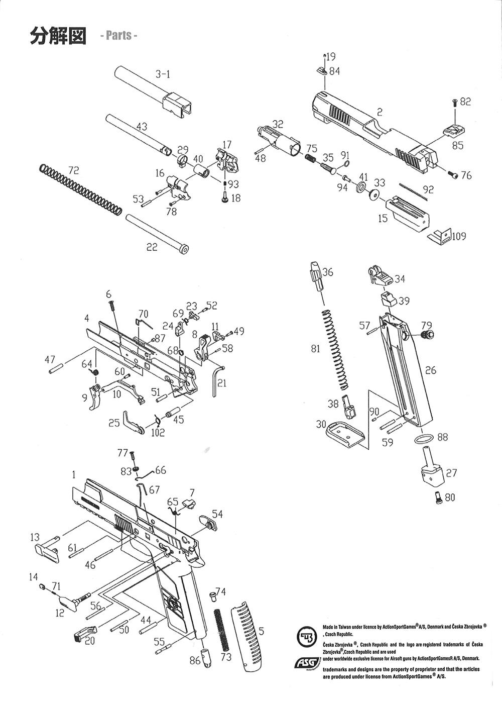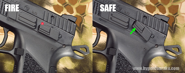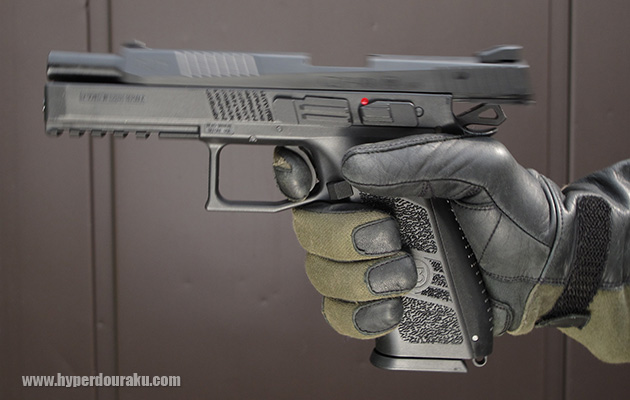 CZのライセンスを取得しているため、刻印やマークも実銃同様に再現しています。また両手で構えたときに左親指がつくところにステッピングが施されており、ホールド感も良好です。
