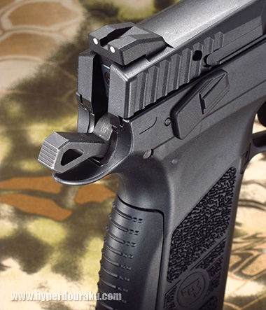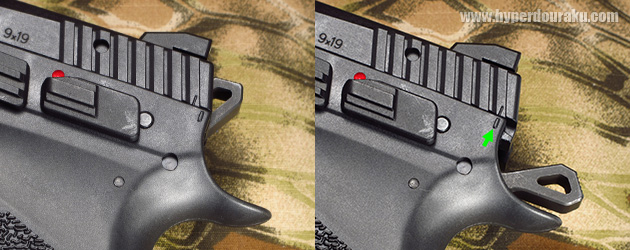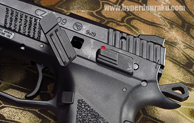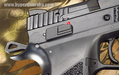 薄く幅広いスライドストップレバーとセフティ、レッドドットはいかにもCZの特徴といえる箇所です。