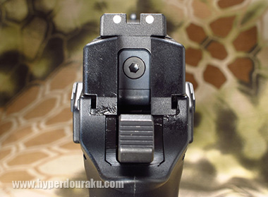 右のシングルアクションではかなり遊びがあり、ハンマーが落ちるまで遠い感じがしますし、ここでハンマーが落ちるという感触がわかりにくいです。これはトリガーを軽くするためにその分、ストロークが長くなるという現用ハンドガンに多くみられる傾向なのですが、ガバ系になれているとトリガーのムニュムニュ感に違和感があります。ま、サバゲの時はそんなこと関係なしに撃ちまくるのであまり関係はありませんけどね。