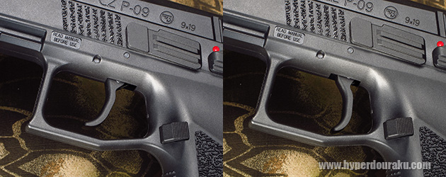 左はダブルアクション時のトリガー位置です。遊びはほとんどなく、一気に引く感じです。トリガープルは東京マルイのSIG P226と同じくらいの感触でした。