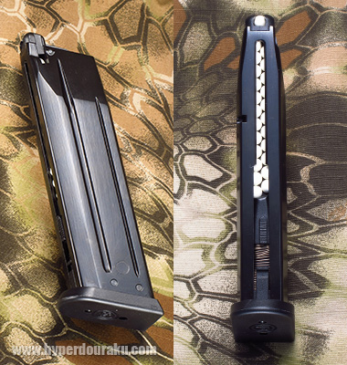マガジン装弾数は25発。マガジン上部からBBローダーを使用しても、フォローワーを下げてもBB弾を装填できます。マガジン重量は約350gです。