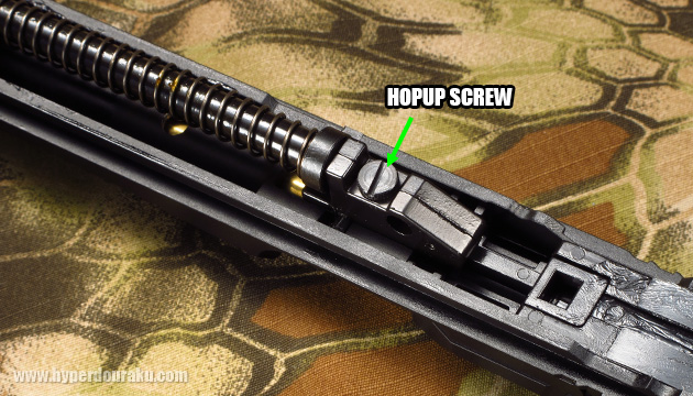 可変ホップアップはチェンバー下部のスクリューをマイナスドライバーなどで調整します。時計回りでホップアップが強くなります。このスクリューは指でも操作は可能ですが微妙な調整は難しいかもしれません。