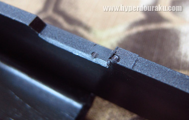 スライドのボルトストップがかかる箇所に金属のピンが打ち込まれており、スライドの摩耗と破損を防いでいます。プラ製スライドの弱点に対処していて嬉しい配慮ですね。