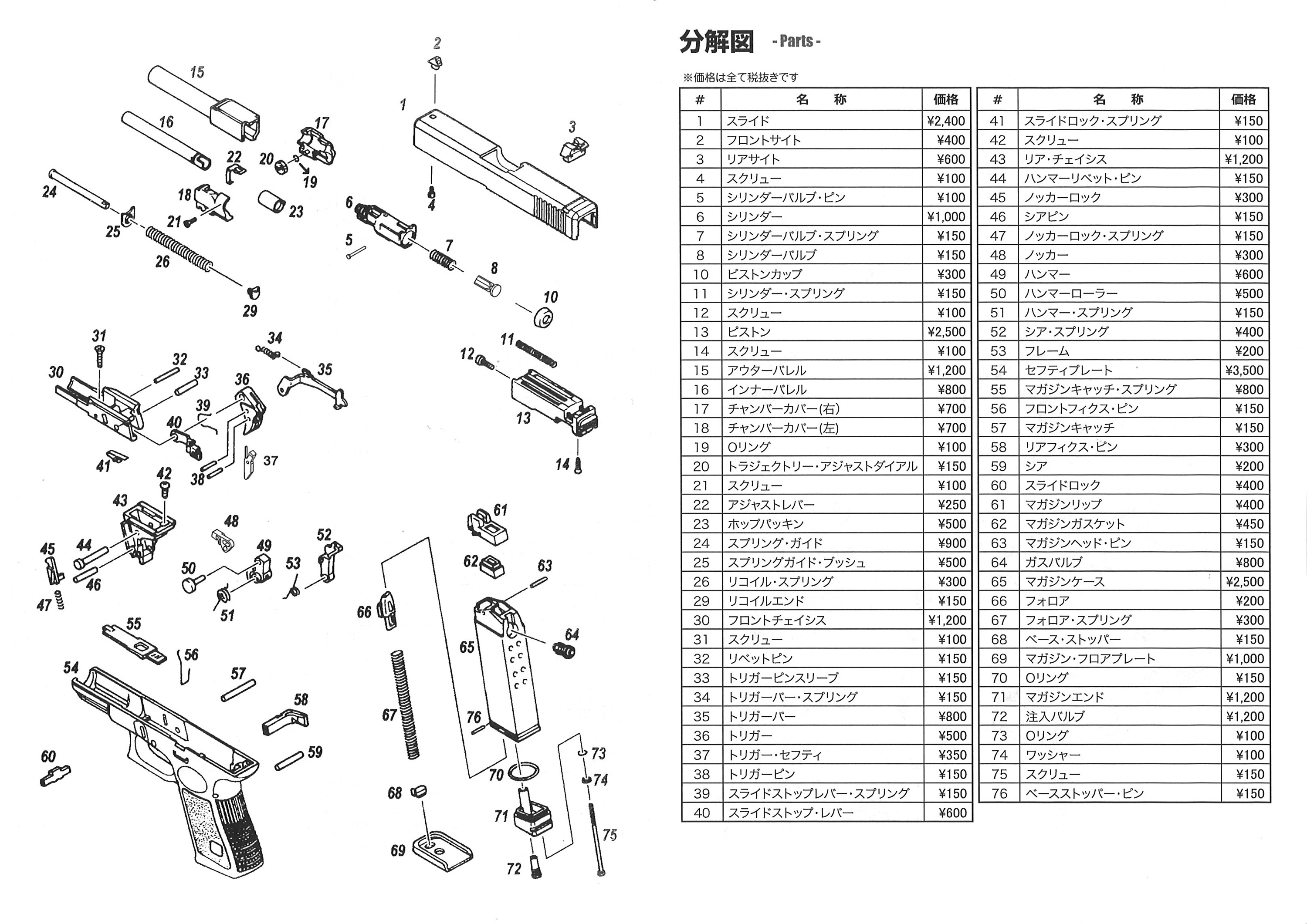 実銃同様にトリガー上にある両側にあるレバーを引きながらスライドを前方へ引き抜き、工具なしで通常分解が可能です。