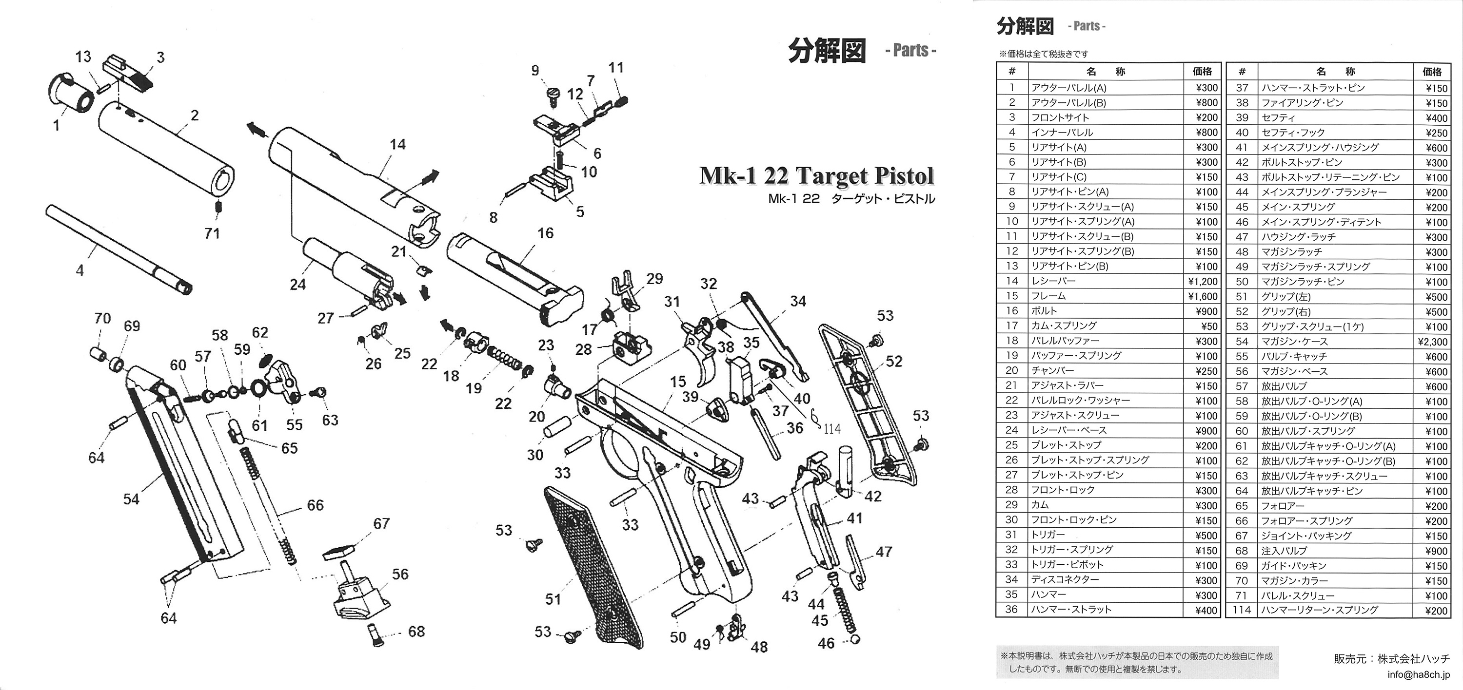 以前、流通していたMK-1と違い、ハッチ取り扱い品のガス放出口は真鍮のカバーが追加されています。径を小さくしてパワーを落としていると推測されます。マルシンのものも、今は真鍮カバーが装着されているようです。 バルブのスプリングなどもすべて日本の規制に対応するよう調整済みです。