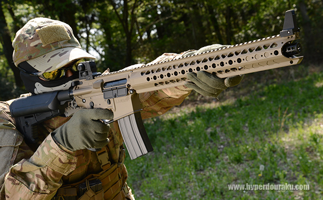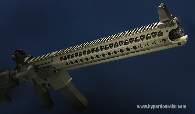 ハイダーギリギリまでレールが覆う独特なスタイルのLVOAレール。非常に肉厚でがっしりした造りです。バレル長はM4より微妙に長い14.7インチバレルとのことです。レールのために見た目以上に長く見えます。