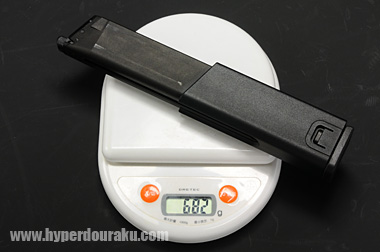 なんといっても重いのがこの49連マガジン。亜鉛ダイキャスト製で682gもある。これだけでハンドガン1丁分の重さ。