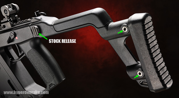 これまた独特な形状のストック。根元のストックリリースボタンを押せば右側面へフォールディングできる。またバットプストック近くのネジを緩めればバット部の長さを調節できるが、左右4本の6角ネジ(2.5mm)を緩める必要があり、あまり実用的とは言えない。