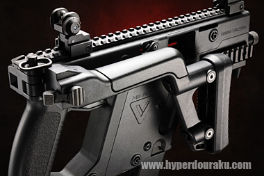 なんとも独特なクリスベクターのスタイリング。実銃同様アッパー、ロアともにレシーバーは樹脂製。細かいシボ加工が施されていて硬質感もあり、質感は高い。