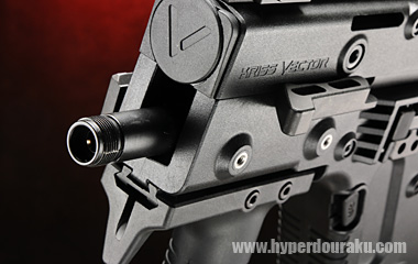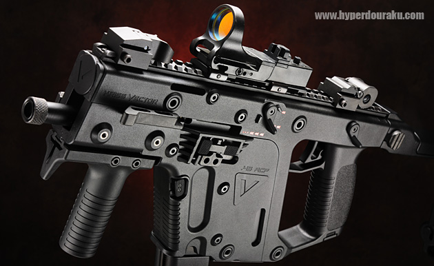 実銃のKrissベクターは米国クリスUSA社(もともとはスイスTDI社)と米陸軍が共同開発したサブマシンガンだ。弾薬は.45ACPを使用する。米国製の.45口径サブマシンガンというとトンプソン(1920年代開発)や、M3A1グリースガン(1940年代開発)、イングラムM10(1960年代開発)などがメジャーだが、どれもかなり古い設計であることから、.45口径のSMGはあまりニーズが無いものかと思っていたが、クリスベクターは2006年に市場に登場した。その特徴はKRISSスーパーVシステム(KSVS)と呼ばれる独自の反動抑制機構で、.45ACPの大きな発射反動をボルトで受け止め、下方へ逃がすという仕組みを採用している。