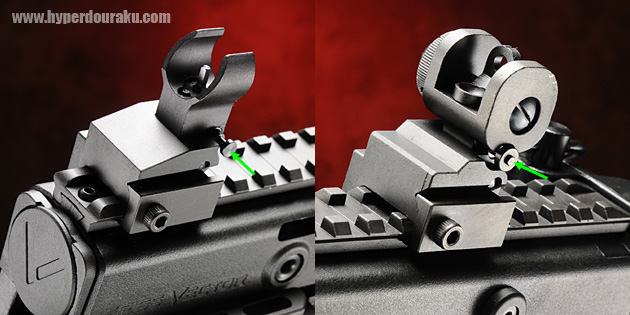 フロントサイトは付属のアジャストツールで上下に調節可能。リアサイトはM16のようなL型ピープサイトで左右のウインデージを調節可能となっている。矢印のピンを押し込めばロックが外れて倒すことができる。