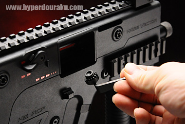 グリップは細身で結構握りやすい。実銃同様に底部の蓋を開けるとグリップ内をコンパートメントスペースとして利用できる。このグリップ底部の形状はマグプル製のものに似ているが、そもそもクリスベクターの設計にマグプル社も関わっているという。