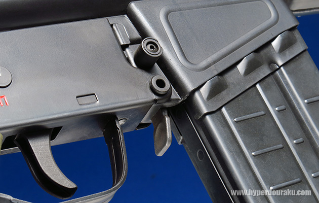 マガジンキャッチはAKのようなレバーを操作してもよいし、レシーバー右側にあるボタンを押してもマガジンを着脱できます。