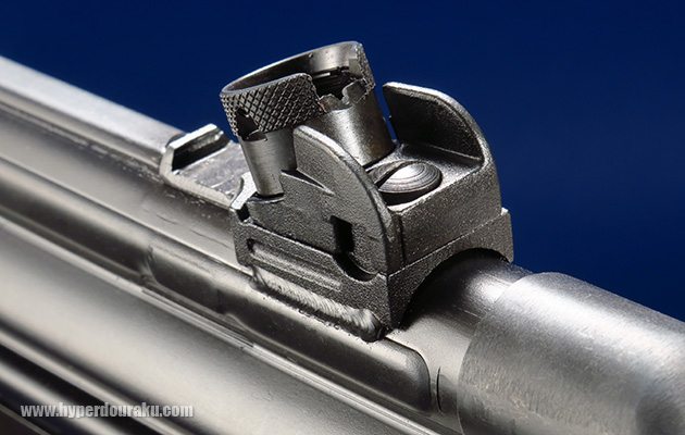円形のガードに囲まれたフロントサイト。このデザインはHKの銃に受け継がれています。