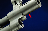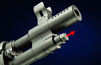 マズル下部のガスシリンダープラグを外し、マズルブレーキ下面にある止めネジを外せばマズルブレーキが前方へ取り外せてM14逆ネジ仕様となる。