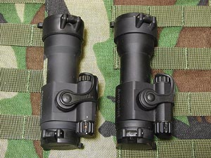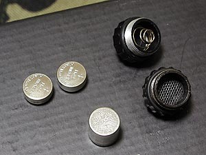 ![]() バッテリーは上がレプリカのLR44 1.5Vが2個直列に対して、実物はUS規格の「DL1/3N」リチウム電池が1個3Vで駆動する。日本だとカメラ用の「CR1/3N」(しーあーる さんぶんのいち) や、「CR1/3 1・HC」が利用可能。秋葉原や大型カメラ店で1個6~700円程度で入手できる。バッテリー蓋のマイナス側形状も違う。マニュアルには1,000~10,000時間のバッテリーライフと記載されている。M2のNVDポジション(つまり0クリック)で10年点灯し続けるとも書いてある。嘘くさい。 |