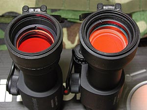 ![]() 左の実物の方が赤みが濃い。また、対物レンズの位置が奥まっている。 |