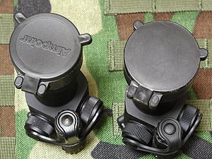 ![]() フロントレンズカバー全面と、やや艶のあるラバーストラップにはAimpointロゴ。 |