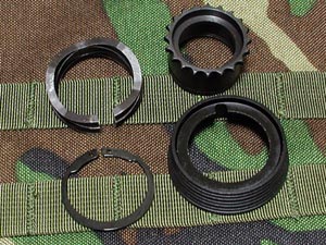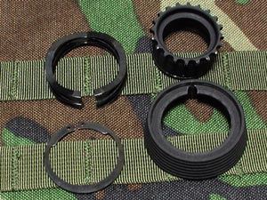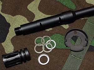 ![]() トリガーハッピーのSF TYPEバレルジャケットサイレンサー。5000円 in 激震祭。まずは付属のアタッチメントをバレルに装着する。フラッシュハイダーが逆ネジでないと取り付けられないので注意。 |