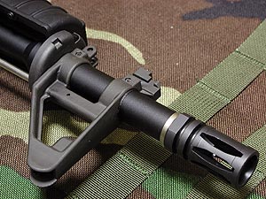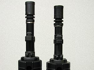 ![]() あとは、フラッシュハイダーを付けたままでも、かぶせるようにガチャポンとサイレンサーを装着できる。外すときも根本をワンタッチで。消音効果はほどほど。消音材は白。 |