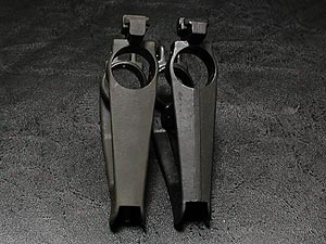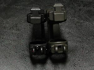 ![]() GUARDERはパーティングラインが研磨してあり、つるりとしている。どちらもエレべージョン式の可動フロントサイトだが、G&Pのフロントサイトは断面が丸形の初期タイプ。GUARDERは断面角形。 |