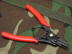![]() フロント周りは専用工具があると便利。これはスナップリングペンチ。ホームセンターで1000円くらい。 |