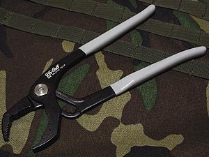 ![]() プライヤー。これもホームセンターで2000円くらいで購入。本来、水回りの塩ビパイプを締め付けるのに使用するが、フロントサイトのピンをこれで圧入する。 |