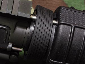 ![]() デルタリングをハンドガードの溝にハメ込むように取り付ける。とても固い。 |